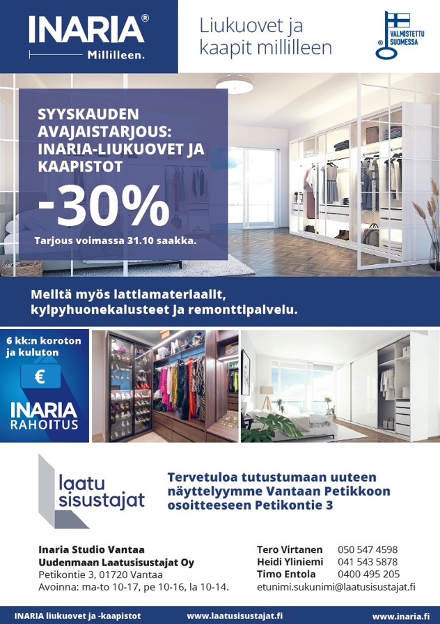 05/06/2025 05/06/2025Palvelemme koko kesän normaalisti. Ma-to 10-17, pe 10-16 ja la 10-14. Tervetuloa!Nyt saat meiltä Inaria-liukuoviin sekä -kaapistoihin jopa 6 kk korotonta […]